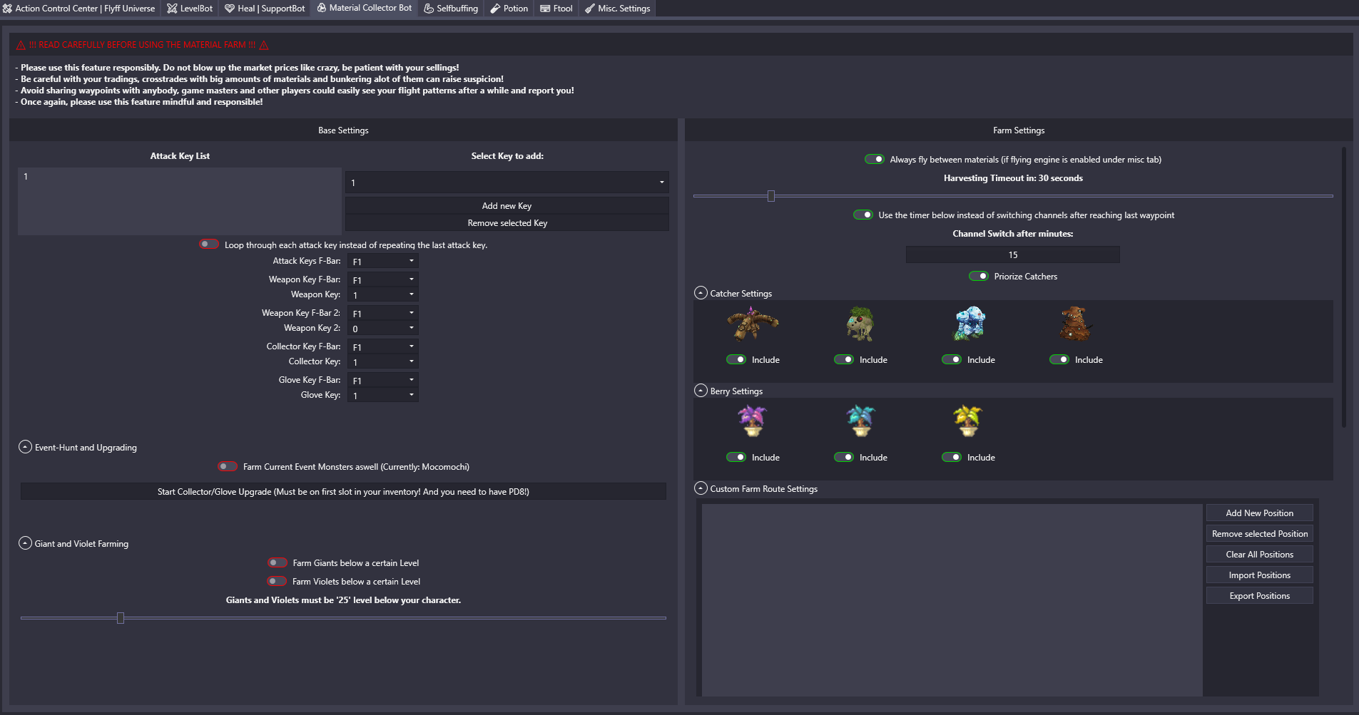 This feature allows you to automatically fight Catchers and collect their resources, as well as farming Berries of your choice, using your own defined waypoints.